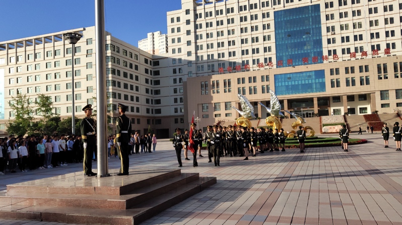 升旗仪式前,全体师生有序列队,注视学校国旗护卫队队员迈着整齐的步伐,护送国旗。七时整,伴随着雄壮激昂的义勇军进行曲,鲜艳的五星红旗在国歌声中迎着旭日冉冉升起,五星红旗迎风飘扬,全体师生行严肃的注目礼。